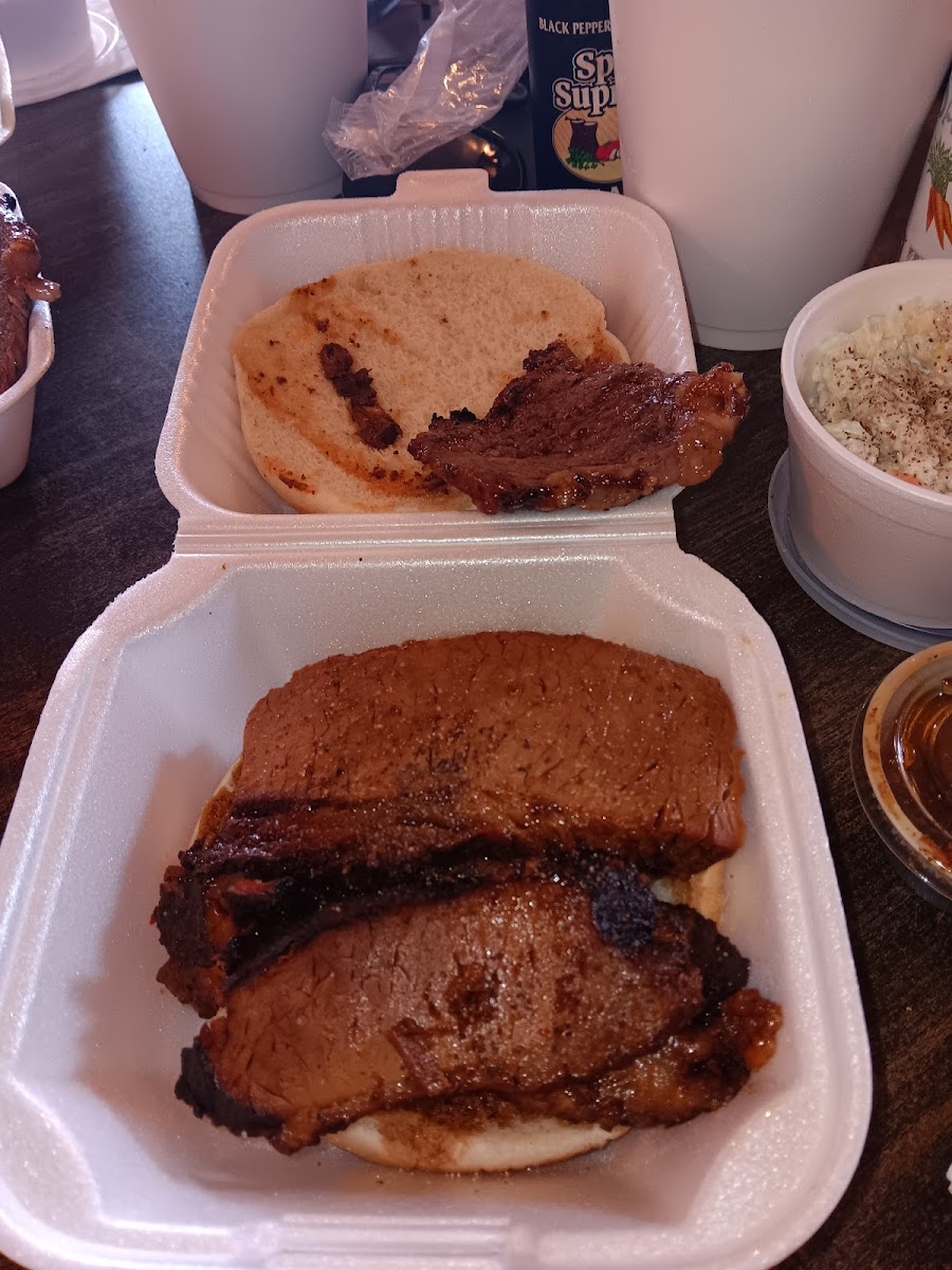 This place is great. Stopped in on a motorcycle ride with my son. The brisket and pulled pork were some of the best I've had. The staff was friendly and welcoming, the portions were large, and the price was reasonable. It's a new destination for us when we are out biking. I want to try the steaks, but the brisket was so good I'm not sure I can pass it up next time I'm there. Bring cash as they don't take plastic, and do yourself a favor and skip breakfast before you go there so you can eat more of their amazing food!